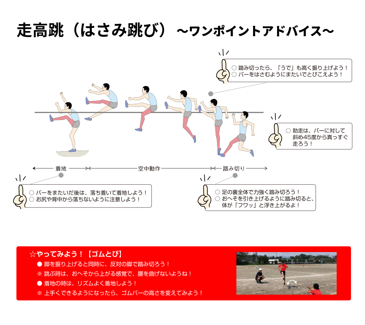 はさみ跳びで競技を行うので、マットへの着地は足裏からとし、背や腰などからの着地は無効試技となります。2回続けて失敗すると終了となります。